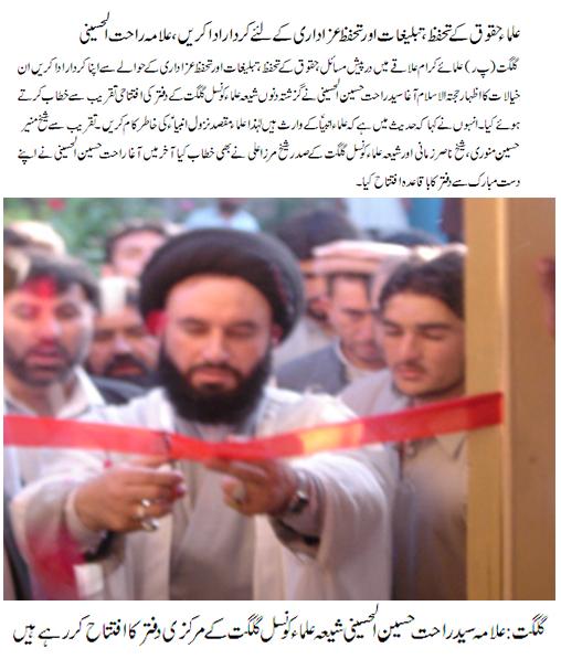 گلگت: حجتہ الاسلام علامہ سید راحت حسین الحسینی نے اپنے دست مبارک سے شیعہ علما کونسل گلگت کے صوبائی دفتر کا افتتاح کیا۔