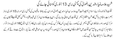 :: 6th Martyrdom Anniversary of Shaheed Aga Zia Ud Din Rizvi :: HAFTA-E-FAROUG -E- FIKR E SHAHEED RIZVI declraed by STAC Gilgit Balitstan. Central Programme to be held on 16th Jan 2011 at Marazee Imamia Jamia Masjid Gilgit