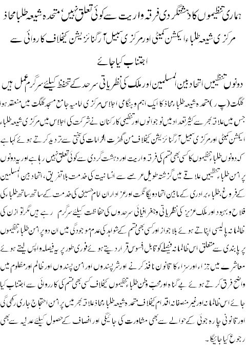 ان خیالات کا اظہار مرکزی انجمن امامیہ گلگت کے صدر فقیرر شاہ نے اےک ہنگامی اجلاس سے خطاب کرتے ہوئے کےا۔ انہوں نے وزارت داخلہ سے منسوب مےڈےا پر چلنے والی خبر کہ جس کے مطابق گلگت بلتستان مےں دہشت گردی کے بے بنےاد الزامات کے تحت دو محب وطن اور پر امن طلباءتنظےموں مرکزی شیعہ طلباءایکشن کمیٹی اور سبیل آرگنائزیشن کومحض توازن کی ظالمانہ پالےسی اپناتے ہوئے پابندی عائد کرنے کے فےصلے پر اپنے رد عمل کا اظہار کرتے ہوئے کہا کہ ہمارا ےہ دےرےنہ مطالبہ رہا ہے کہ ہمشہ ظالم اور مظلوم مiں فرق واضح کرتے ہوئے معاشرے مےں جزاءاور سزاءکا قانون عملی طور پر نافذ ہونا چاہئے مگر قانون نافذ کرنے والے ادارے اور ارباب اقتدار توازن کی پالےسی کو اپناتے ہوئے ظالم اور مظلوم کو ایک ہی صف میں کھڑ ا کررہے ہےں